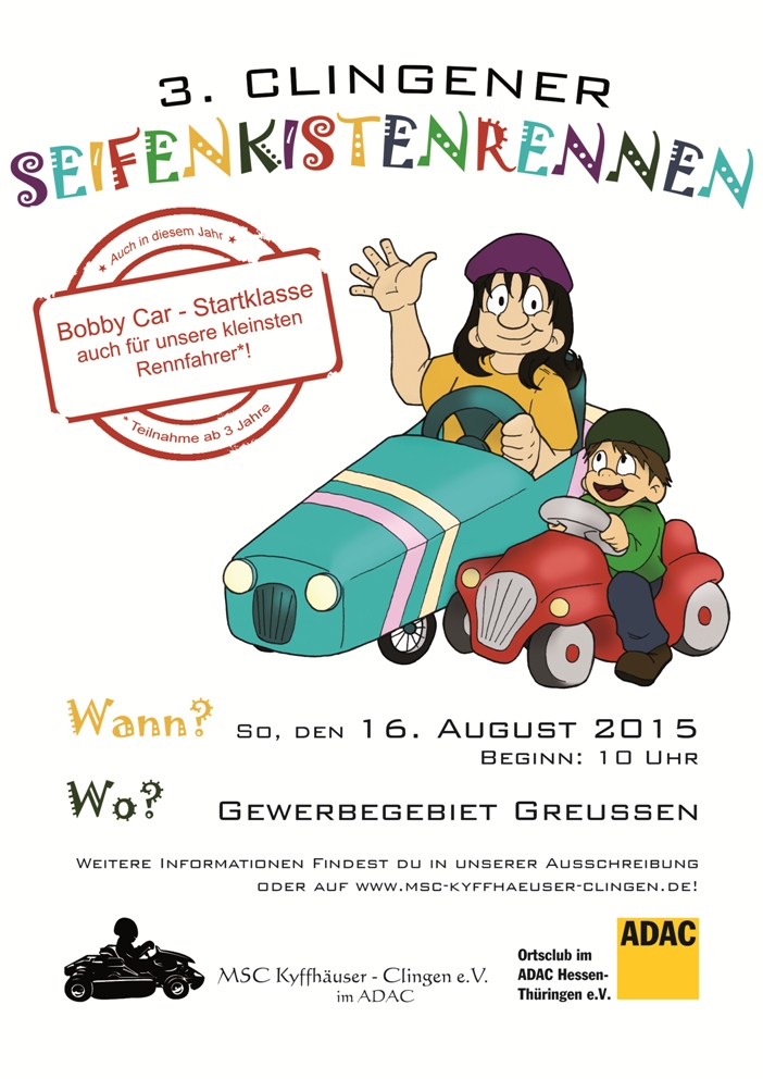 Die Planung ist abgeschlossen, wir können Ihnen nun schon einmal die Ausschreibung für unser drittes Seifenkistenrennen am 16.08.2015 präsentieren. Alle wichtigen Informationen sind darauf zusammen gefasst.